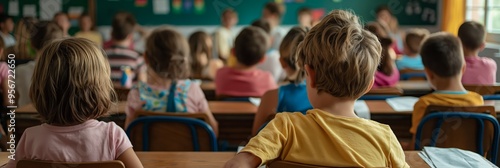 This image captures a group of children seated in a classroom, facing the front where learning seems to be taking place, reflecting education, growth, and childhood curiosity.