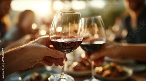 This image captures a moment of two people clinking their wine glasses together, celebrating or toasting against a beautiful sunset backdrop, emphasizing friendship or celebration.