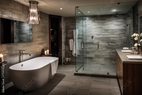 This image depicts a bathroom featuring a tub and sink, providing a practical and welcoming environment, A luxurious modern bathroom with a soaking tub and glass shower, AI Generated