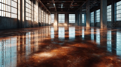 This image depicts a bright, spacious industrial interior with large windows and a reflective floor, creating an open and airy atmosphere ideal for creative projects.