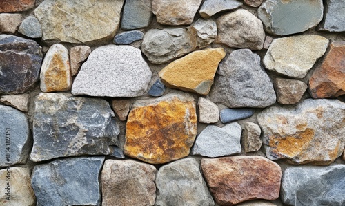 This image displays a rustic stone wall featuring a complex pattern of stones in different colors and shapes, revealing the artistry in construction techniques