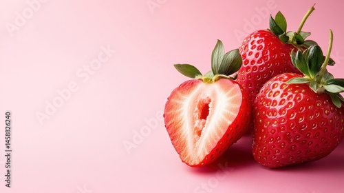 This image displays strawberries alongside a pink background, emphasizing their shine and freshness, ideal for food promotion, recipes, and health-focused content.