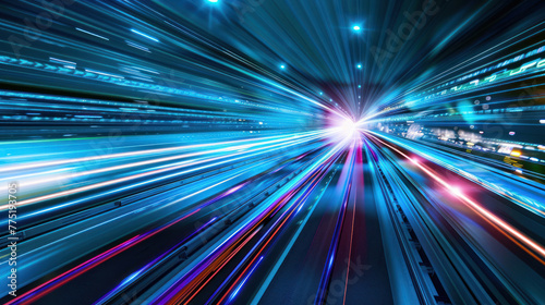 This image exhibits a powerful light speed effect with a predominant blue and white color scheme, showing movement