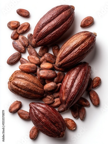 This image features a collection of cocoa pods and cocoa beans arranged artfully, suitable for uses in food blogs, culinary projects, or any material related to chocolate production and recipes,