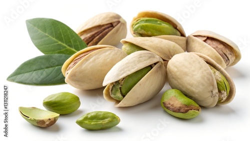 This image features a collection of pistachios, both in their shells and shelled, arranged on a white background