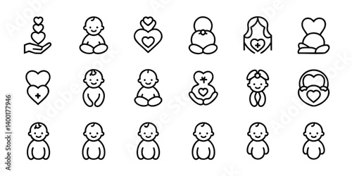 This image features a collection of simple, black line art icons depicting various stages of pregnancy and baby development