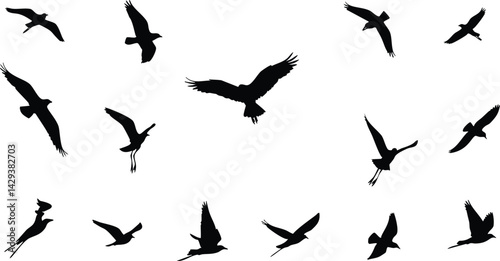 This image features a collection of various bird silhouettes in flight against a plain white background