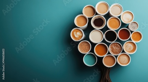 This image features a creative design where numerous coffee cups, each filled with different shades of coffee, are arranged to form a tree-like shape on a blue background.