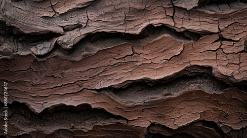 This image features a detailed shot of a cracked, dried tree bark surface, emphasizing its unique, rugged texture, and rich brown hues, ideal for nature-themed projects.