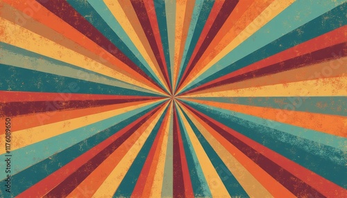 This image features a dynamic sunburst design with bold, vibrant colors radiating from the center. The warm hues of orange, red, and teal create a nostalgic atmosphere, perfect for evoking a sense of