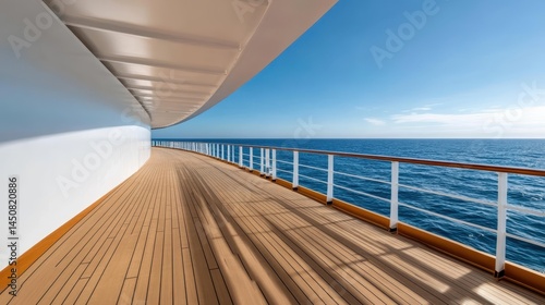 This image portrays an elegant cruise ship deck that curves elegantly towards the endless ocean, offering a tranquil and spacious perspective on a sunny day, evoking relaxation.