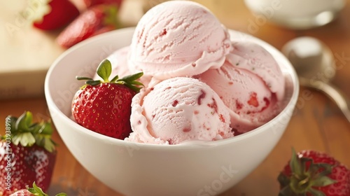 This image showcases a beautiful serving of vegan strawberry ice cream in a white bowl, accompanied by fresh strawberries on a wooden table, creating a delightful dessert presentation