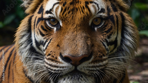 This image showcases a close up of a tiger's face. The tiger has a rich, orange brown coat with distinctive black stripes and white markings around its eyes and muzzle.