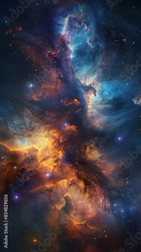 This image showcases a stunning nebula with vibrant hues of blue, orange, and purple. The swirling clouds of gas and dust are illuminated by starlight, creating a dynamic and captivating cosmic scene.