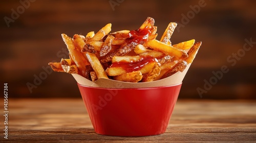 This image showcases a tempting portion of crispy golden French fries served in a vibrant red cup, accompanied by a drizzle of rich ketchup, making it perfect for food lovers.