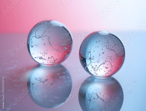 This image showcases two transparent spheres adorned with swirling patterns, gently resting on a reflective surface, set against a pink and blue gradient backdrop.