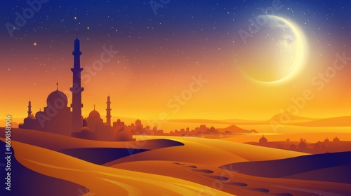 This image shows a serene desert night scene featuring a crescent moon, beautiful architecture with mosque towers, and a captivating gradient of twilight colors across the sky.