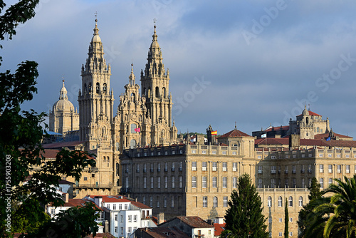 This impressive image captures the majesty of the Santiago de Compostela Cathedral as seen from the historic Plaza del Obradoiro