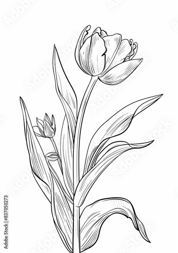 This is a black and white line drawing of a tulip flower with a bud. The image is perfect for coloring and would be a great addition to any coloring book or art project