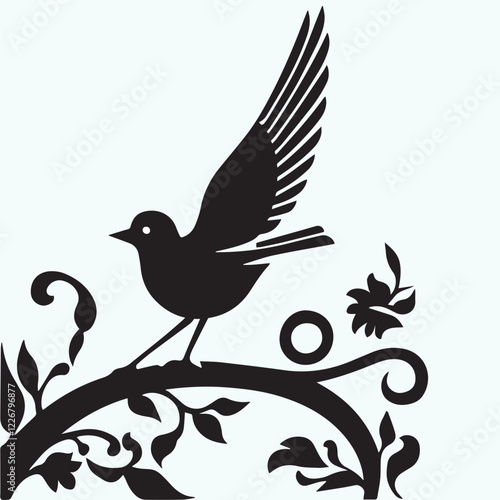 This is a black and white silhouette image of a bird perched on a branch. The bird is facing to the left, with its wing lifted as if it's about to take flight or is in the middle of flapping.
