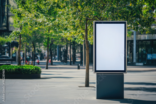 This is a blank advertising billboard standing on a city street with people walking in the background