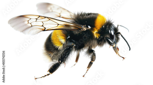 This is a photo of a bee. The bee is black and yellow and has a long proboscis. It is flying in mid-air in isolated on transparent background
