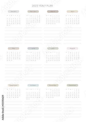 This is a simple, minimalist style annual planner with a year 12 month calendar for 2023. Note, scheduler, diary, calendar planner document template illustration.