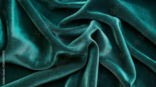 This luxurious velvet fabric in deep emerald green displays a rich texture with its smooth, flowing drapes, making it ideal for upscale upholstery, fashion, or decor projects.