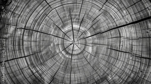 This monochrome photo captures the detailed cross-section of a tree ring, showcasing the age and intricate natural patterns, perfect for scientific and educational visuals.