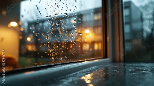 This moody image showcases a rainy window adorned with intricate droplets, featuring glowing lights from outside, evoking feelings of nostalgia and peaceful solitude.