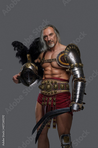 This regal, aged gladiator exudes strength and dignity in sleek, lightweight armor, holding a gladius sword and helmet against a grey background