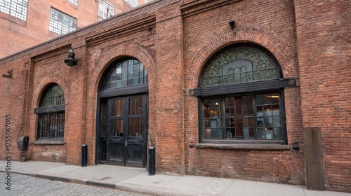This scene features a historic brick building with large arched windows. The exterior is well-preserved reflecting rich architectural details.