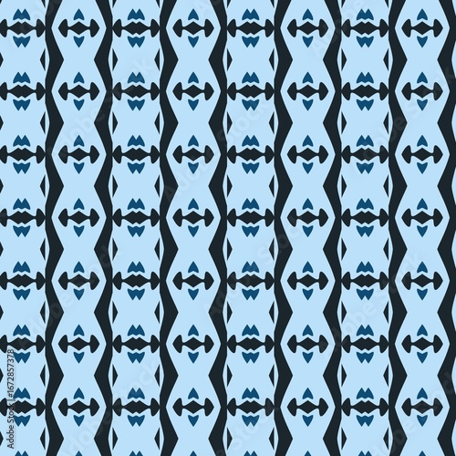 This seamless geometric pattern features abstract vertical stripes with stylized tribal motifs, creating a bold ethnic design in a monochromatic blue palette