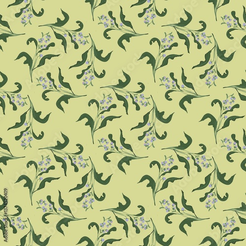 This seamless pattern features delicate blue flowers with green leaves on a green pastel background. The elegant floral vines intertwine gracefully, creating a vintage, romantic, and timeless design