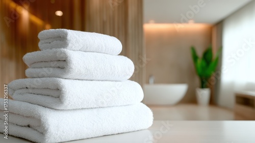 This serene image presents a stack of neatly arranged white towels in a tranquil spa setting, evoking a sense of relaxation and comfort in a minimalist environment.