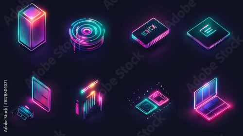 This set includes ten different icons representing hardware development. The icons are modern and stylish, with bright neon colors and a geometric design.