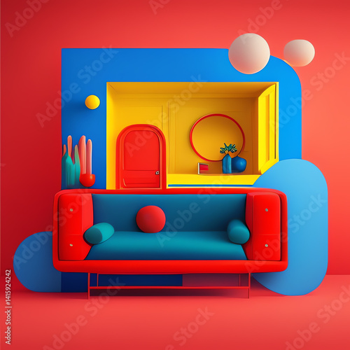 This striking living room features bold colors and unique shapes creating an inviting atmosphere perfect for modern interior design inspiration.