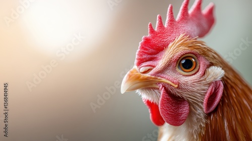 This stunning close-up captures the intricate details of a chicken's face, showcasing its vibrant colors and texture in a beautifully blurred background.