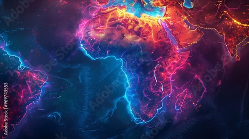 This stunning neon display features a colorful representation of the world map, with bright lines accentuating Africa and its neighboring continents set against a dark backdrop