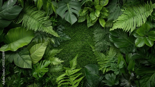 This stunning overhead shot showcases a variety of lush green plants and leaves, representing nature's beauty and tranquility, perfect for bringing peace and freshness to any space.