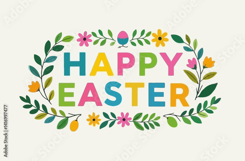 This vibrant illustration features the phrase "Happy Easter" in large, colorful block letters, each uniquely shaded in cheerful tones like purple, yellow, green, and blue.
