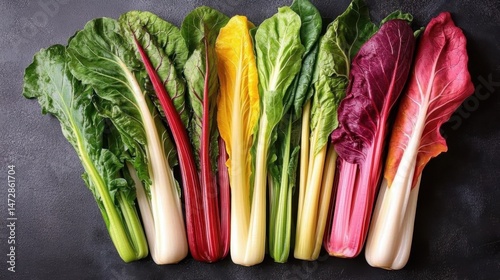 This vivid display showcases a variety of Swiss chard leaves, each with bright stems, exemplifying freshness and vibrancy that evokes healthy eating choices.