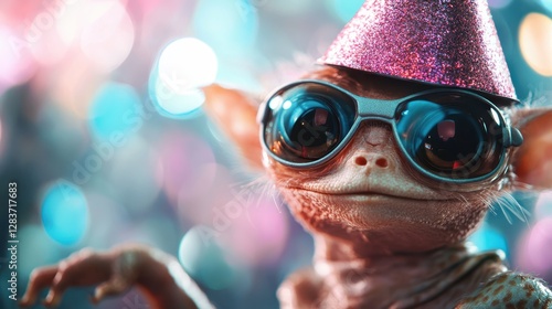 This whimsical creature with big eyes is dressed for a party, complete with a shiny hat and stylish sunglasses, set against a colorful and festive backdrop.
