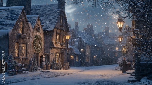 This winter scene shows a snow-covered street filled with cozy cottages and glowing windows in a quaint village.