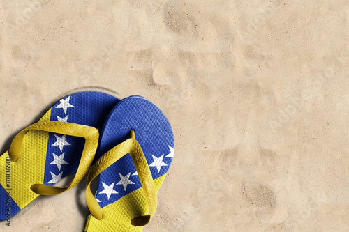 Thongs with flag of Bosnia and Hertzegovina, on beach sand