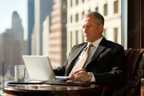thoughtful adult businessman sits in his office and works on a laptop. a business person in a black suit makes a report, finances. successful business