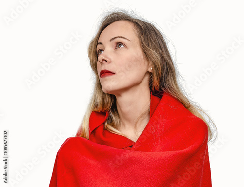 Thoughtful blonde woman wrapped in red scarf, on white background. Looking up.