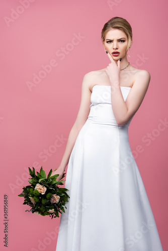 thoughtful bride in white wedding dress holding flowers isolated on pink