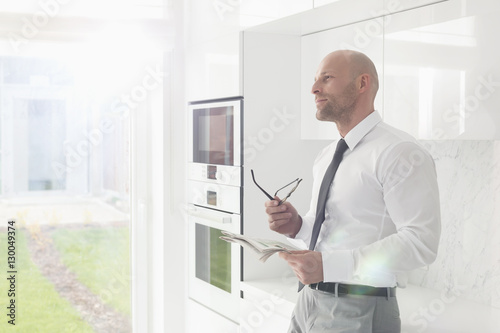 Thoughtful businessman holding newspaper at home