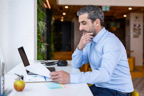 Thoughtful businessman reading documents at co working space